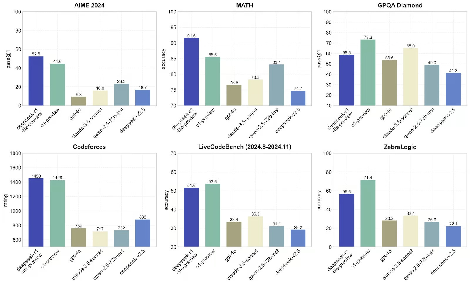 DeepSeek R1 has outperformed the top models from each provider in almost all major benchmarks. It has achieved 91.6% accuracy on MATH, 52.5% accuracy on AIME, and a Codeforces rating of 1450. This makes it one of the most powerful reasoning model available today.